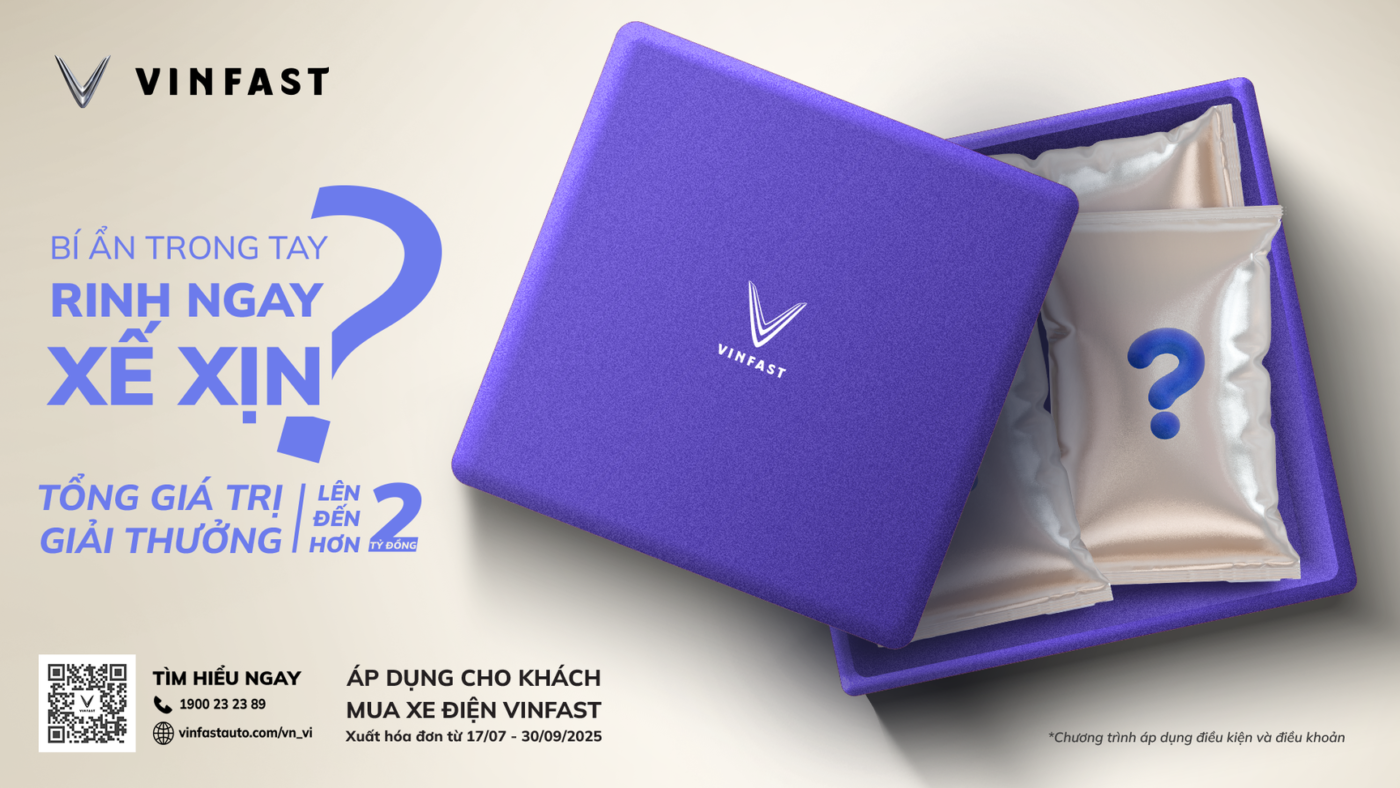 Từ ngày 17/07/2025 đến hết ngày 30/09/2025, VinFast triển khai chương trình khuyến mại đặc biệt mang tên “Bí Ẩn Trong Tay – Rinh Ngay Xế Xịn”, với tổng giá trị giải thưởng lên tới 2.275.970.000 đồng dành cho khách hàng mua xe ô tô điện VinFast trong thời gian diễn ra chương trình.