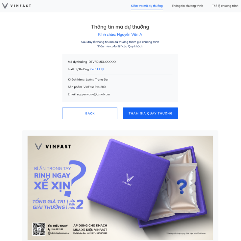 - Hệ thống sẽ tự động gửi thông báo xác nhận kết quả trúng thưởng cho Khách Hàng từ email VinFast (địa chỉ email: noreply.vn@vinfastauto.com) đến địa chỉ email Khách Hàng đã đăng ký tại VinFast sau không quá 05 phút kể từ thời điểm Khách Hàng xác định trúng thưởng.