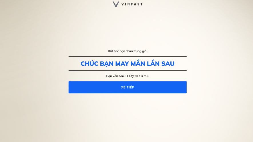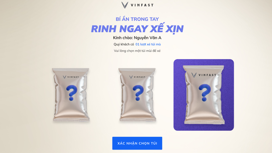 Mỗi khách hàng đủ điều kiện sẽ nhận được lượt tham gia trò chơi trực tuyến “xé túi mù” – một hình thức quay thưởng ngẫu nhiên trên website chính thức của VinFast. Cụ thể: